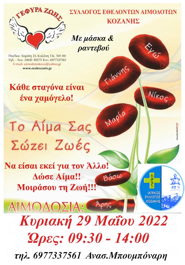 Την Κυριακή 29 Μαΐου Αιμοδοτούμε με τη συμμετοχή και του Ιατρικού Συλλόγου Κοζάνης από τις 09:30 – 14:30 στα γραφεία του Συλλόγου Αιμοδοτών, Π. Χαρίση 23.