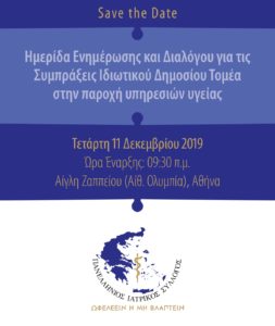 Ο Πανελλήνιος Ιατρικός Σύλλογος διοργανώνει Ημερίδα Ενημέρωσης και Διαλόγου για τις Συμπράξεις Ιδιωτικού Δημοσίου Τομέα στην παροχή υπηρεσιώνυγείας (ΣΔΙΤ) την Τετάρτη 11 Δεκεμβρίου 2019, 10:00 – 17:00 στην Αίγλη Ζαππείου, Αθήνα (Αίθουσα Ολυμπία)