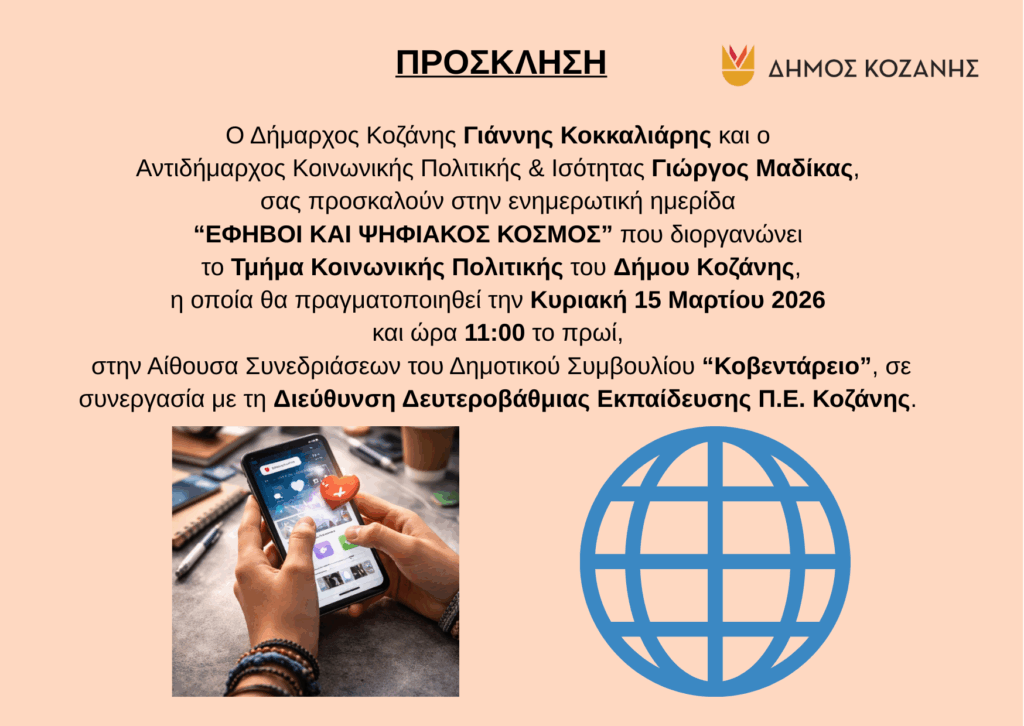 Ο Δήμαρχος Κοζάνης Γιάννης Κοκκαλιάρης και ο Αντιδήμαρχος Κοινωνικής Πολιτικής & Ισότητας Γιώργος Μαδίκας, σας προσκαλούν στην ενημερωτική ημερίδα “ΕΦΗΒΟΙ ΚΑΙ ΨΗΦΙΑΚΟΣ ΚΟΣΜΟΣ” που διοργανώνει το Τμήμα Κοινωνικής Πολιτικής του Δήμου Κοζάνης, η οποία θα πραγματοποιηθεί την Κυριακή 15 Μαρτίου 2026 και ώρα 11:00 το πρωί, στην Αίθουσα Συνεδριάσεων του Δημοτικού Συμβουλίου “Κοβεντάρειο”, σε συνεργασία με τη Διεύθυνση Δευτεροβάθμιας Εκπαίδευσης Π.Ε. Κοζάνης.